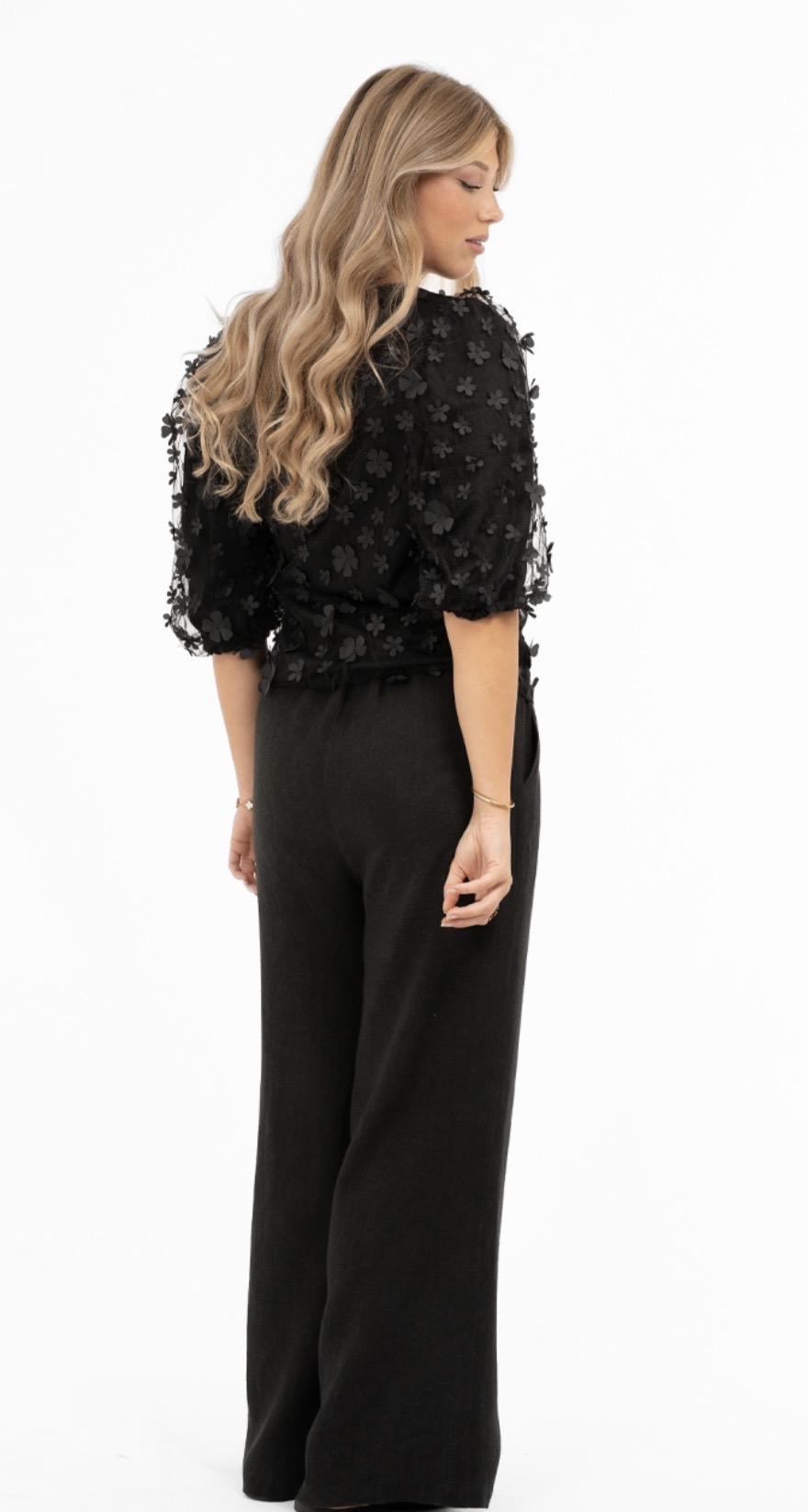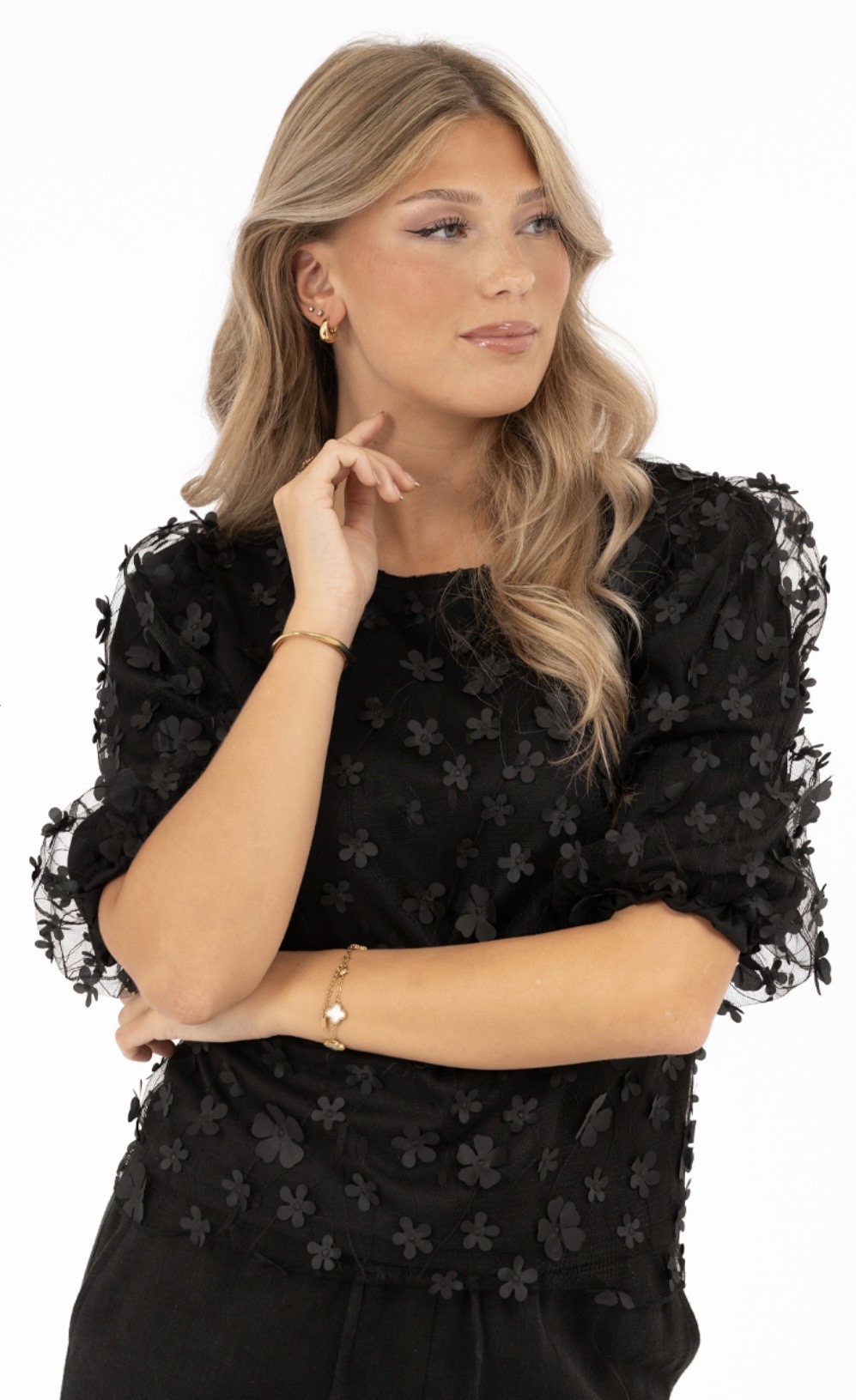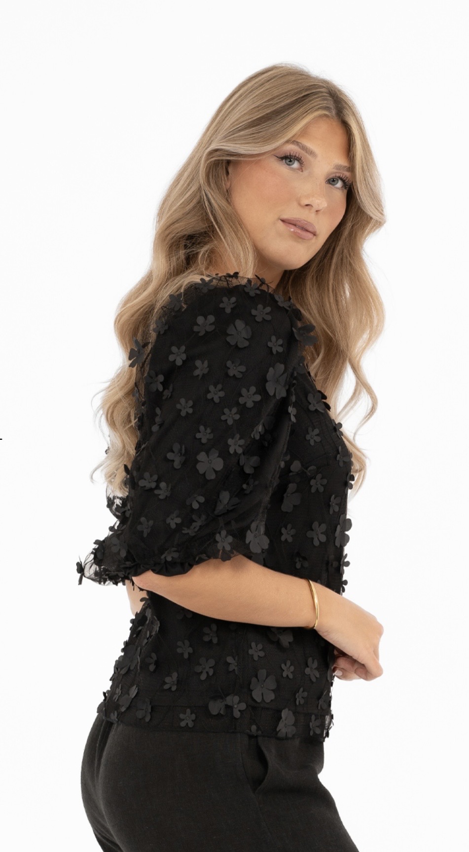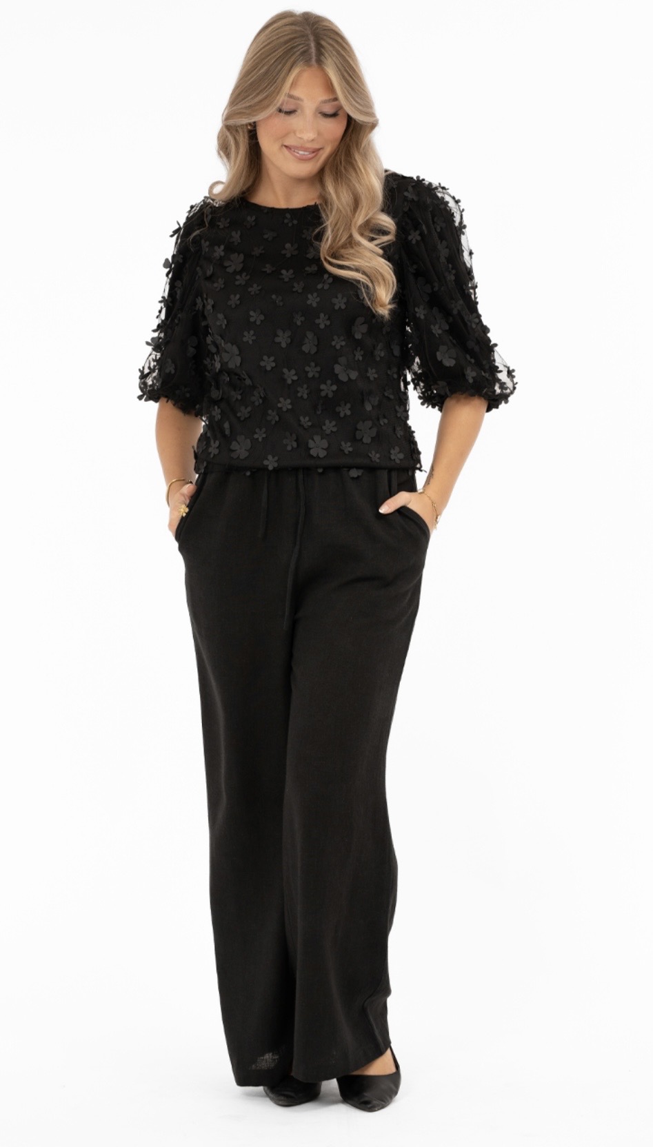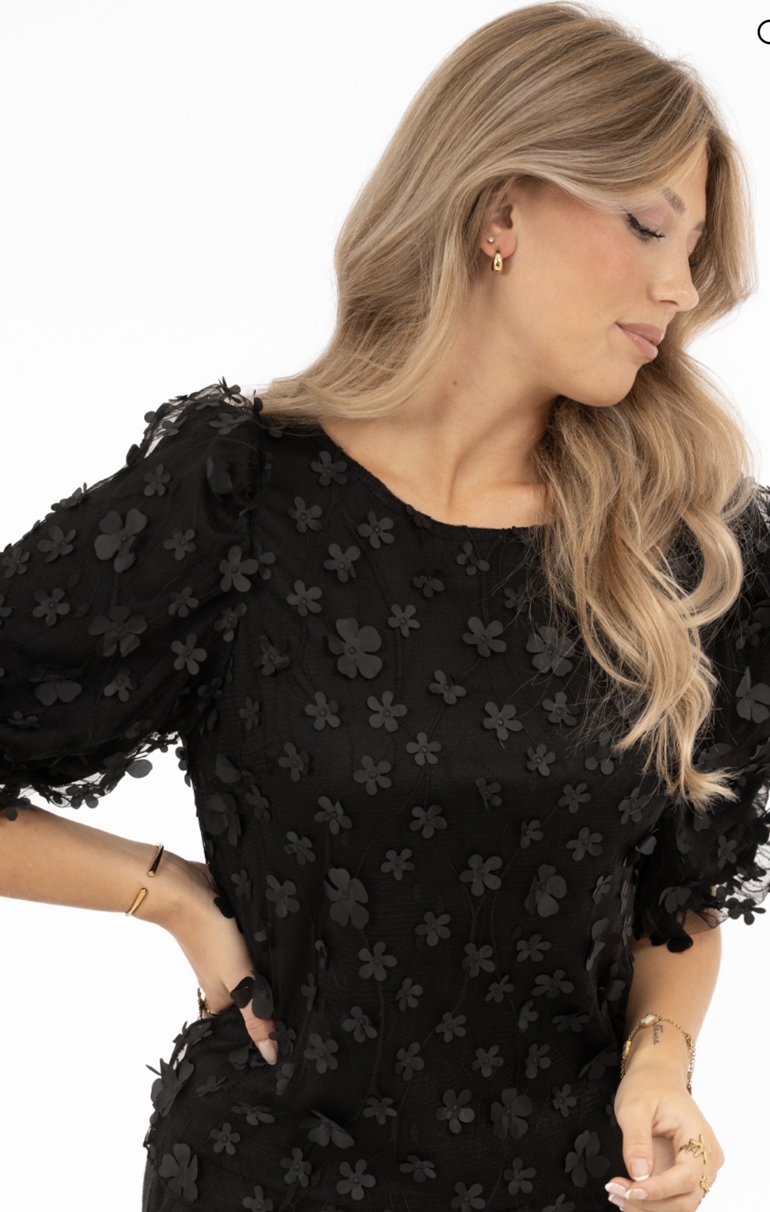 Suloinen ja elegantti kukkapusero, jossa kauniit kohokukat ja upea laskeutuvuus. Pyöreä pääntie ja miellyttävä, kevyt materiaali tekevät tästä täydellisen valinnan niin arkeen kuin juhlavampiinkin hetkiin.
