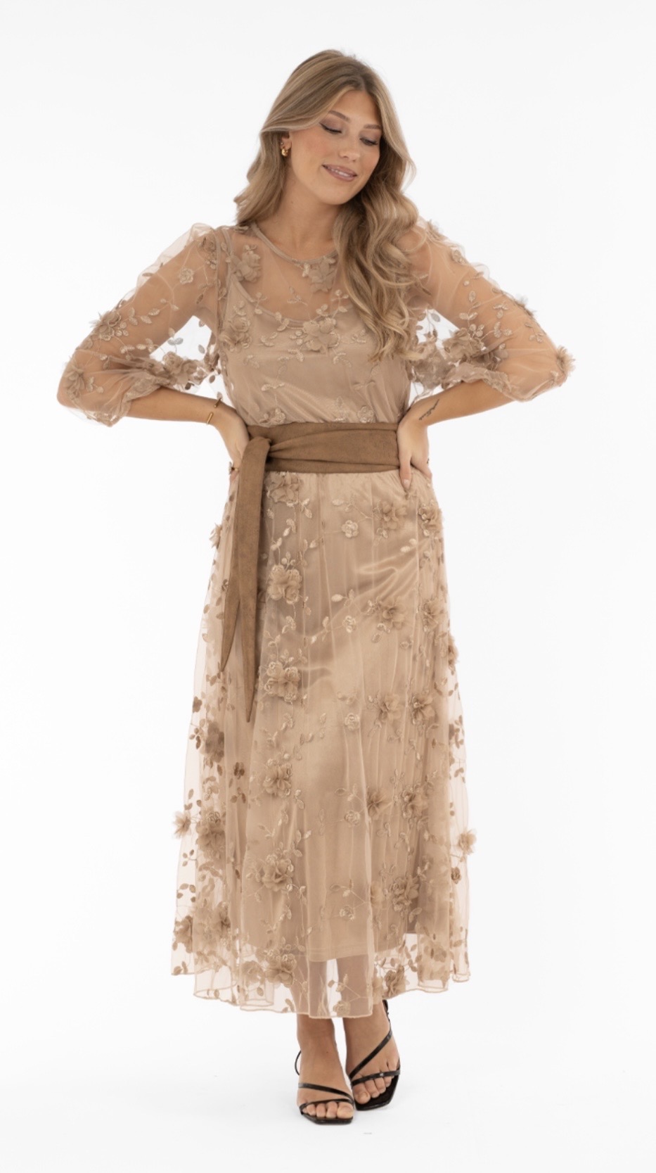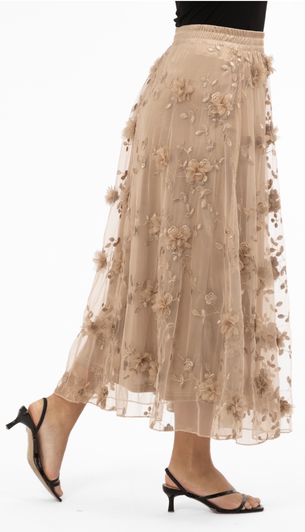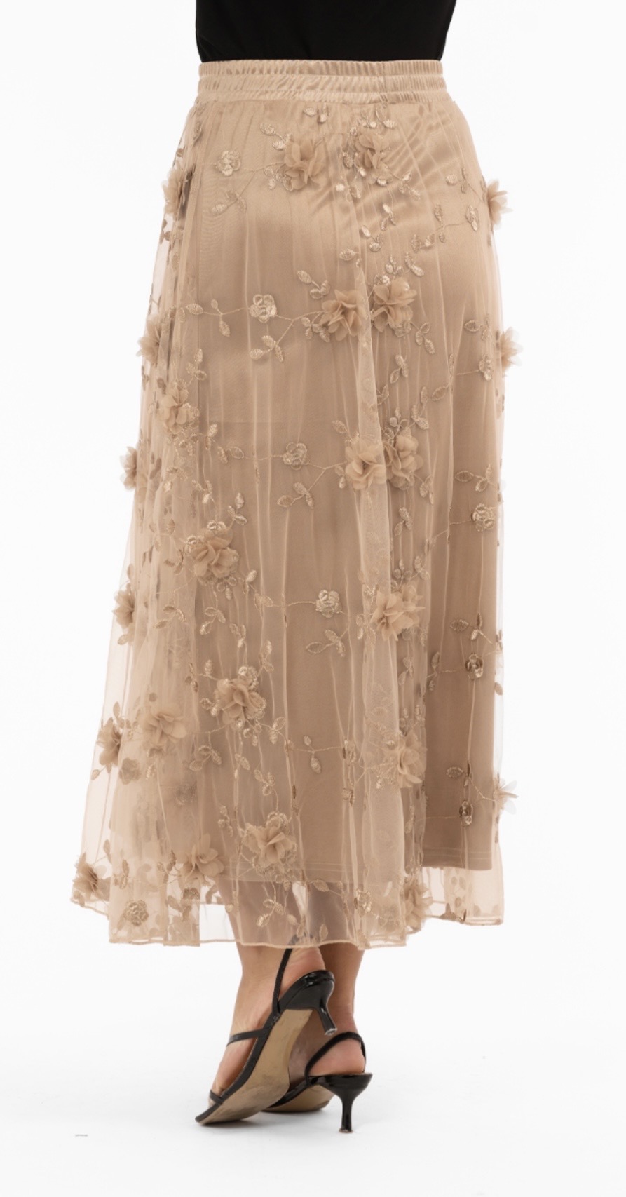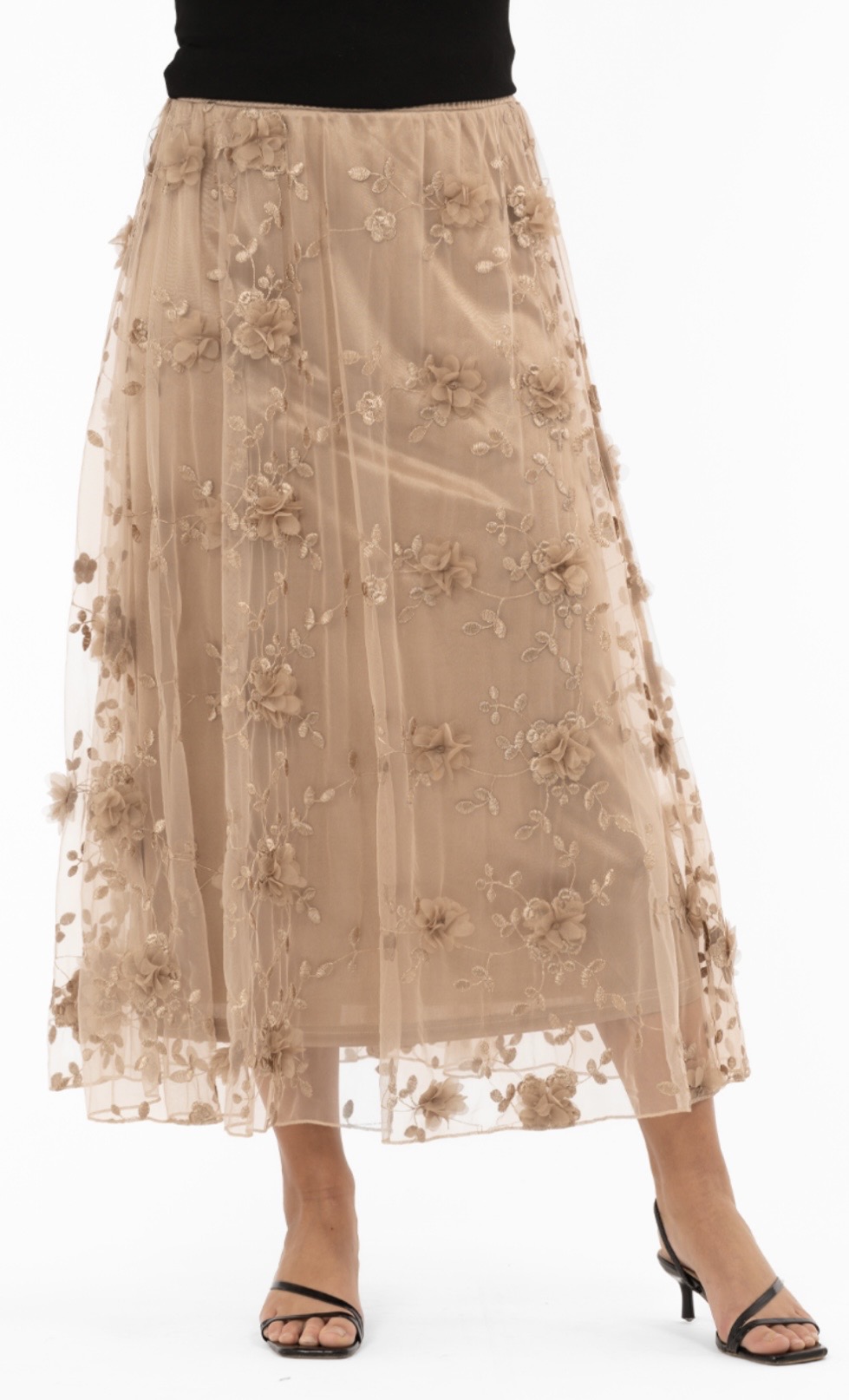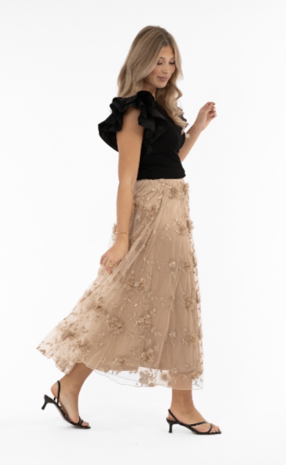 Tyylikäs ja ajaton Capri Collectionin Florence-hame. Kauniin shampanjan sävyinen kangas, jossa kohokuvioitu kukkakuviointi tuo hienostunutta ilmettä. Hame on vuoritettu, joten se laskeutuu kauniisti ja tuntuu miellyttävältä päällä.