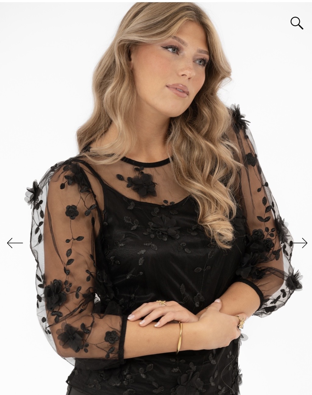 Vajaamittaiset hihat on viimeistelty kuminauhoilla, mikä antaa puserolle kevyen ja ilmavan ilmeen. Kangas on kohokuvioitu ja laskeutuu kauniisti, korostaen vaatteen eleganttia siluettia. Pääntie on klassisen pyöreä.