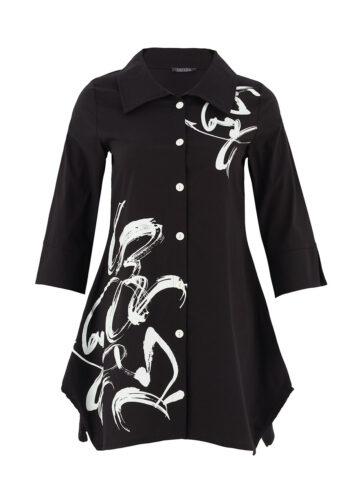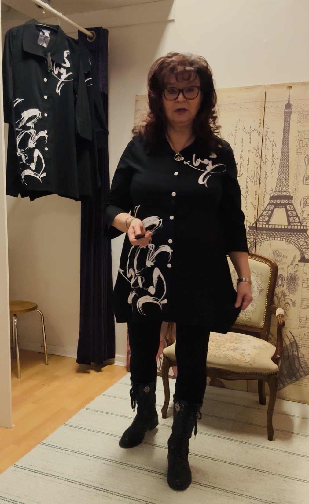 Tyylikäs ja mukava Dolcezzan musta tunika arkeen ja vapaa-aikaan. Tunikassa on kauniit valkoiset kuviot somisteena oikealla alhaalla ja vasemmalla ylhäällä, jotka tuovat ilmeeseen raikkautta. Edessä kaulukset ja valkoiset napit koko pituudelta. Sivuhalkiot lisäävät käyttömukavuutta ja liikkuvuutta. Joustava materiaali istuu miellyttävästi.