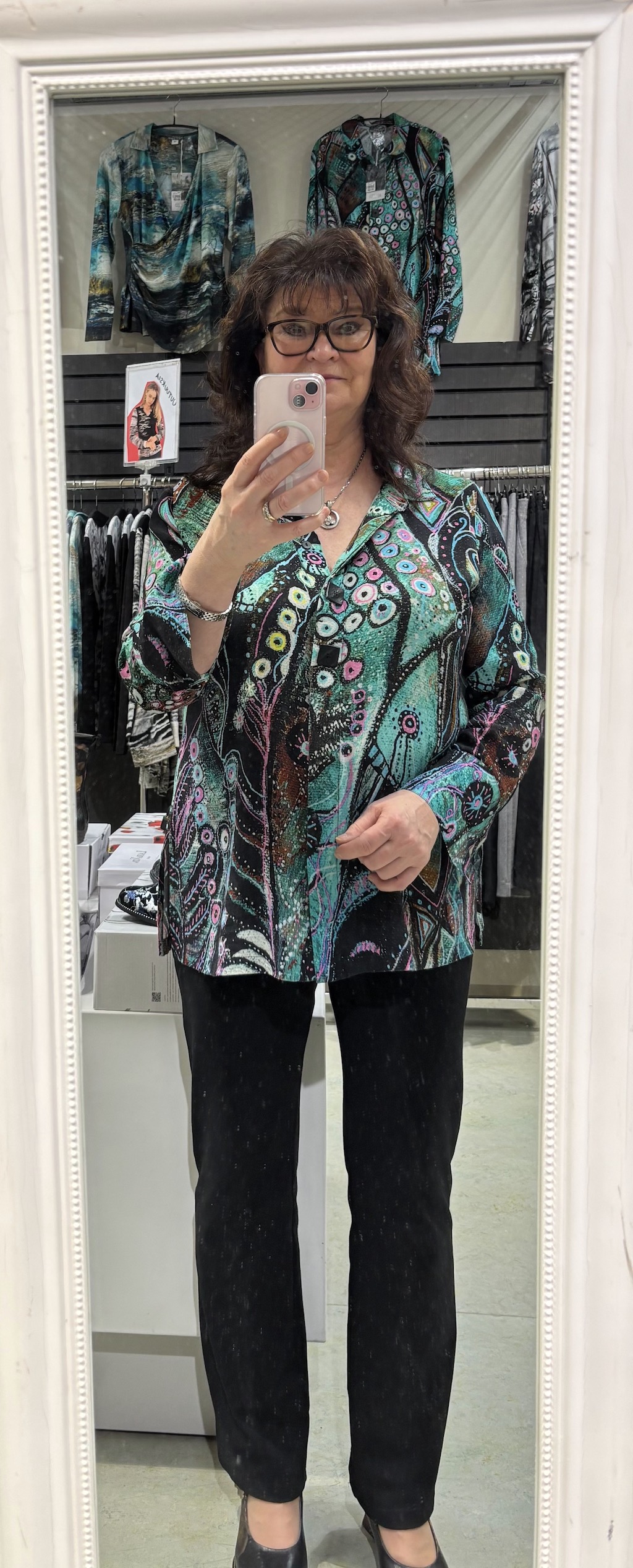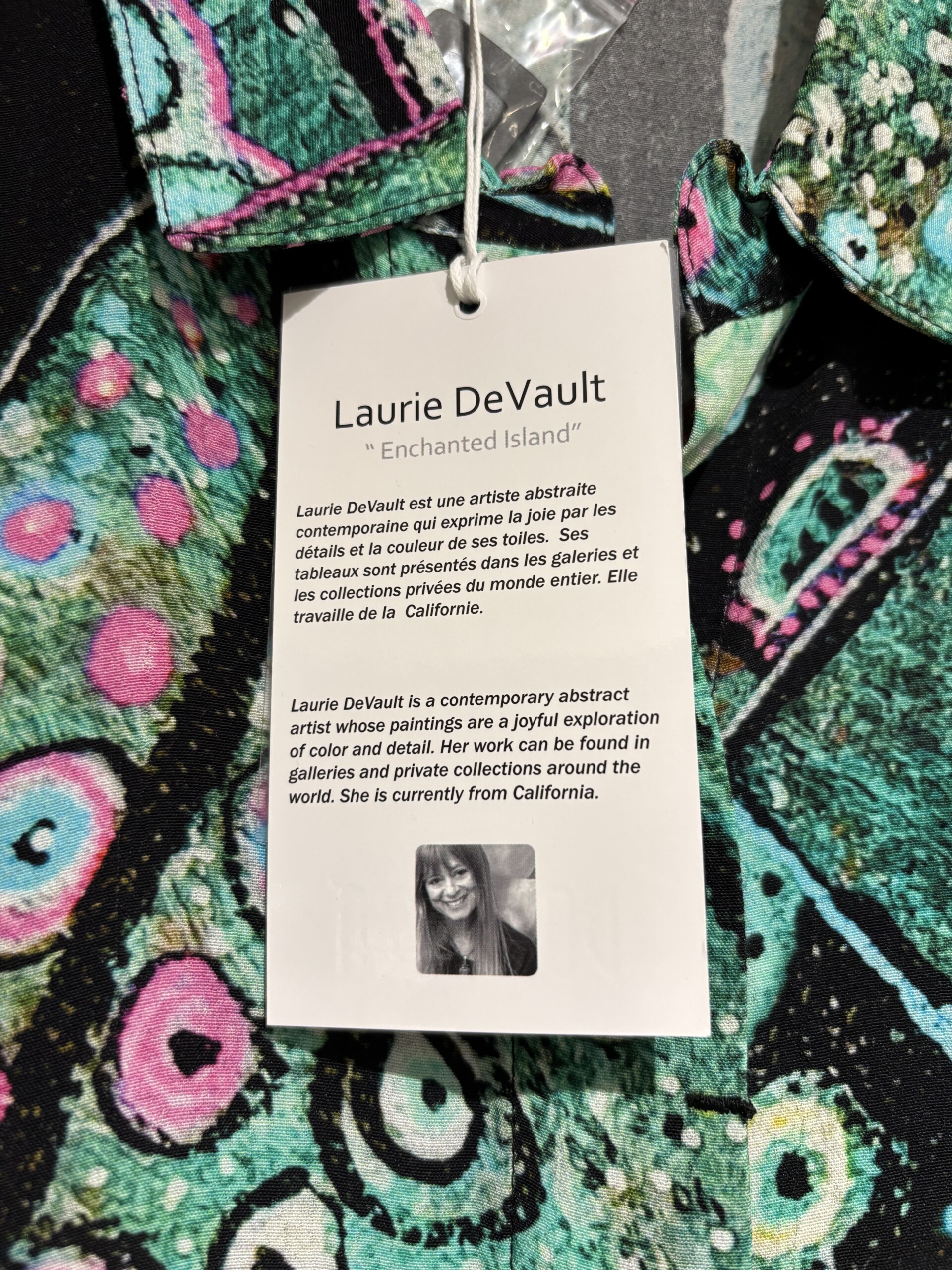 Upeasti kuvioitu Dolcezzan kauluspaita/tunika, jossa yhdistyvät tyylikkyys ja taiteellinen ilme. Kankaassa on taiteilija Laurie De Vaultin taideteos, joka tekee jokaisesta vaatteesta yksilöllisen.