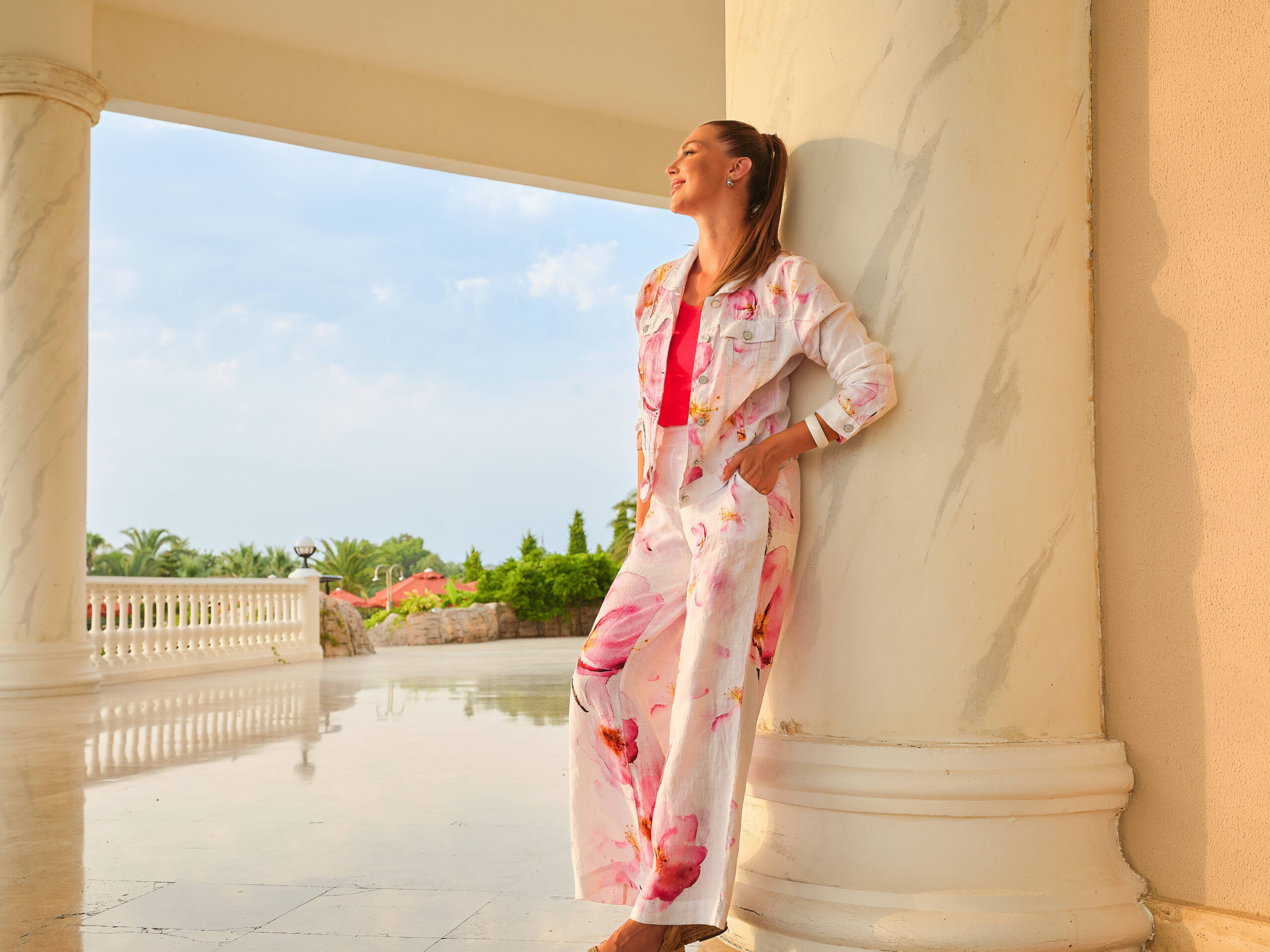 Dolcezzan valkoiset pellavahousut kauniilla pinkillä kukkakuosilla. Housuissa on mukava kuminauhavyötärö takana, käytännölliset taskut sekä trendikkäät leveät lahkeet.  Kevyet ja hengittävät housut, täydelliset kesäkäyttöön.