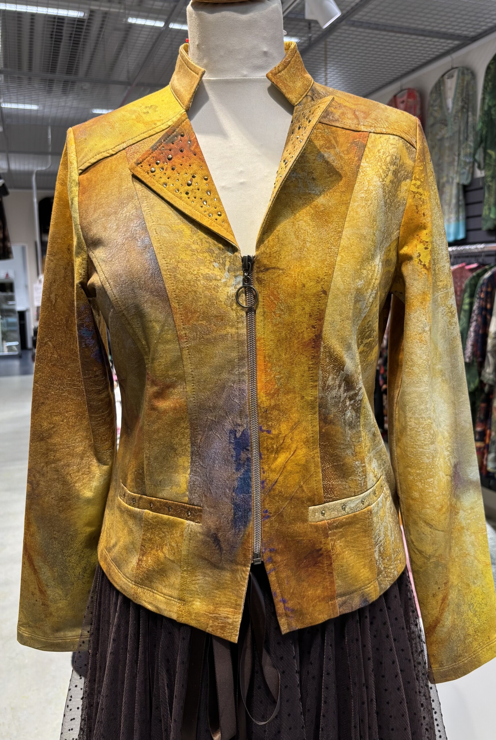 Tyylikäs ja ainutlaatuinen Dolcezza-jakku, jossa yhdistyvät taide ja muoti. Jakun kuosi perustuu taiteilija Annette Schmuckerin teokseen ”Mother Earth”, tuoden yllesi ripauksen luovuutta ja eleganssia.