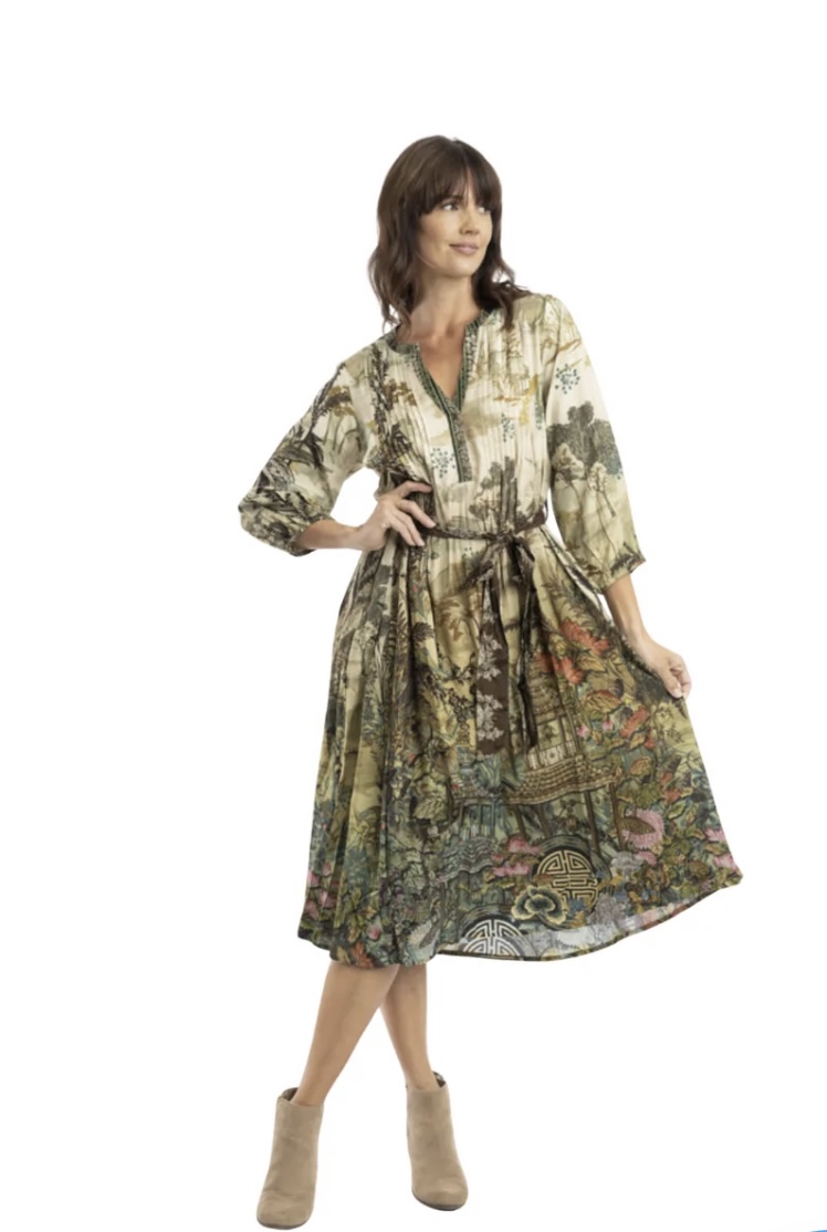 Kuvan kaunis kirjavakuvioitu mekko on valmistettu kokonaan raionista, sivutaskut, 3/4 hiha, v-kaula-aukko, edessä 3 edestä aukeavaa nappia, a-linjainen, pieni pystykaulus, samaa kangasta vyö, pieni laskos edessä ja takana. Escapen on yksi Australian suurimmista luonnonkuituja käyttävistä yrityksistä. Jokainen kuosi on uniikki, vain Escapelle suunniteltu. Materiaali on 100% raion.