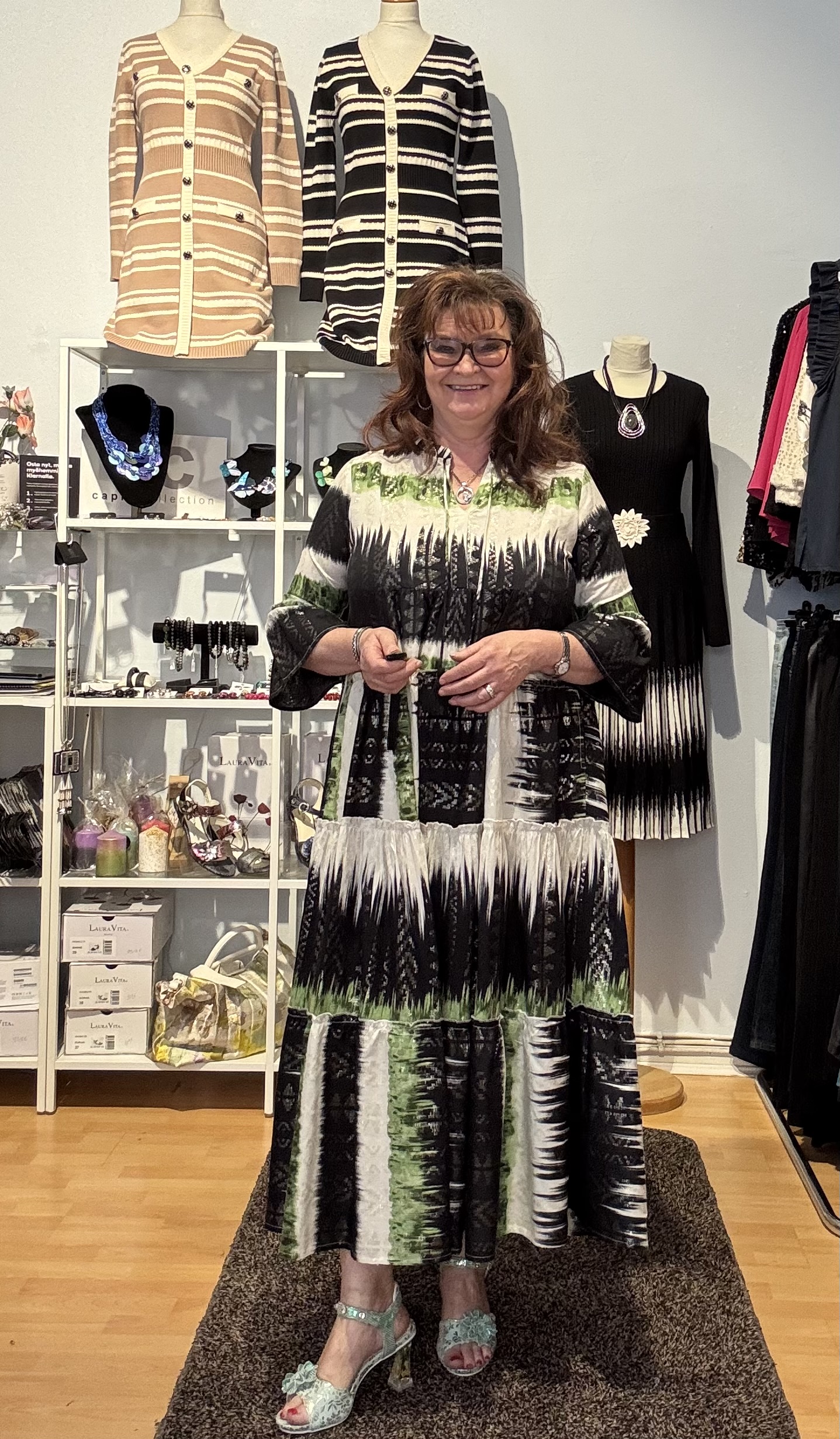 Koko 36 rinnan ympärysmitta 104cm, hiha 43cm, pituus 131cm
