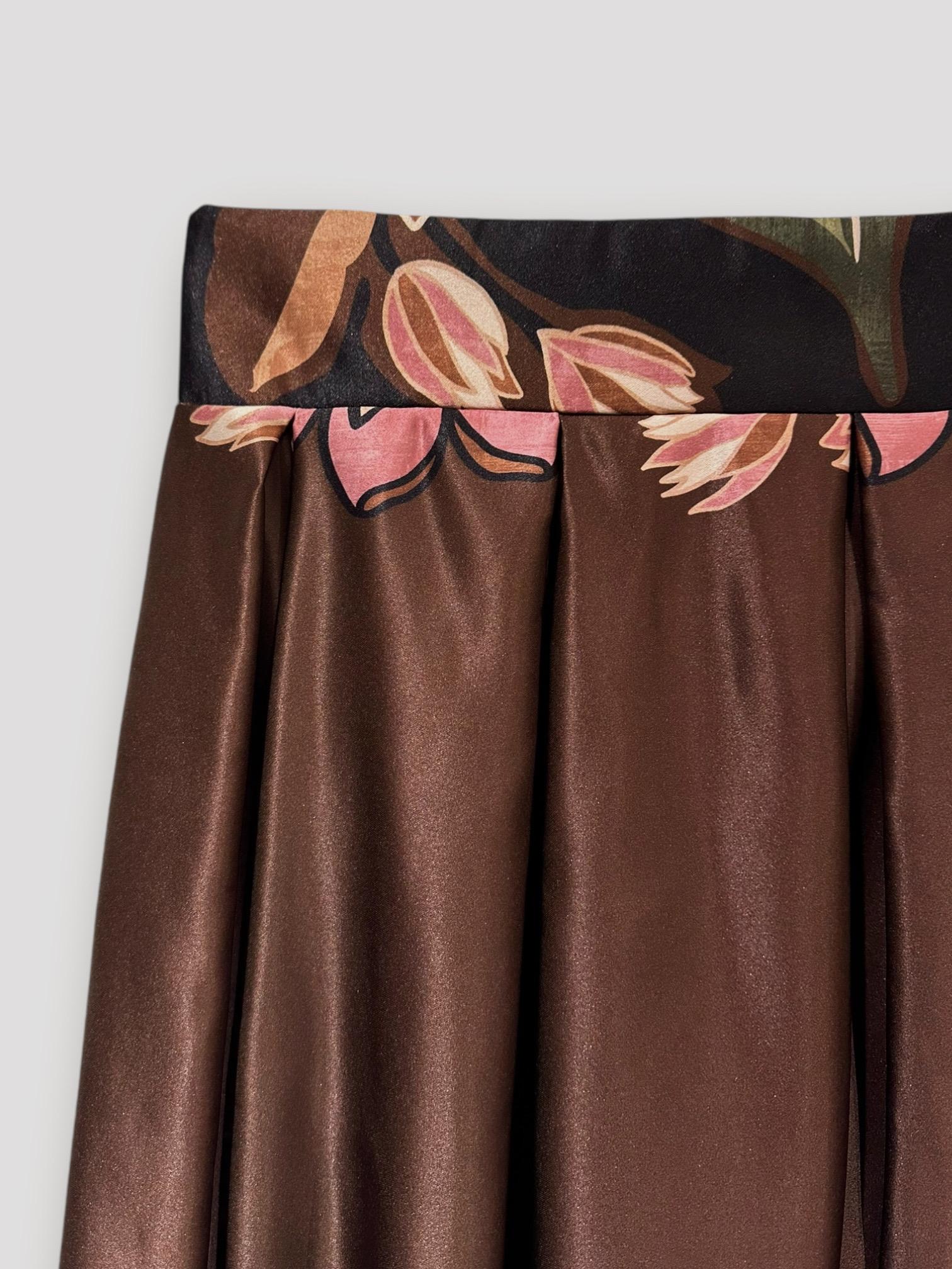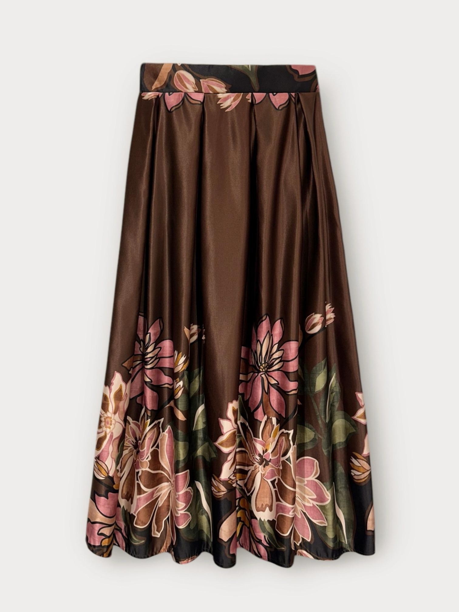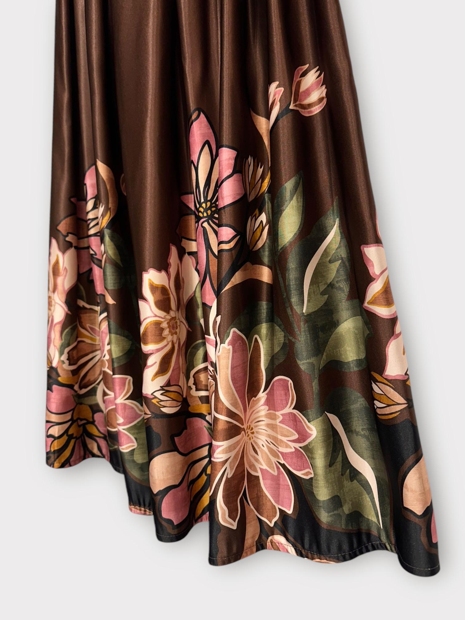 Tämä upea, kukkakuvioitu pitkä hame hurmaa elegantilla tyylillään ja mukavuudellaan. Hameessa on ruskea pohja, joka korostaa kauniisti taiteellista printtiä.