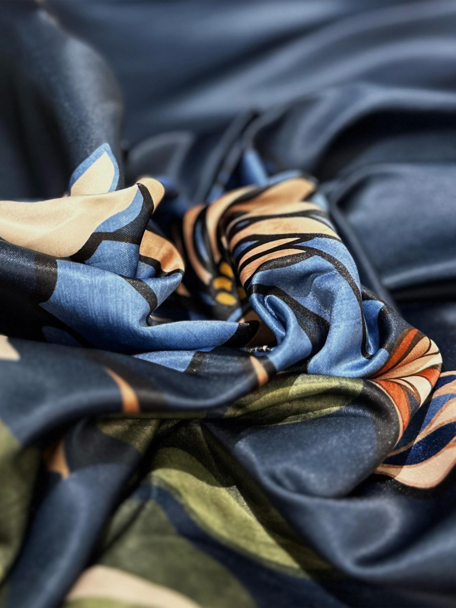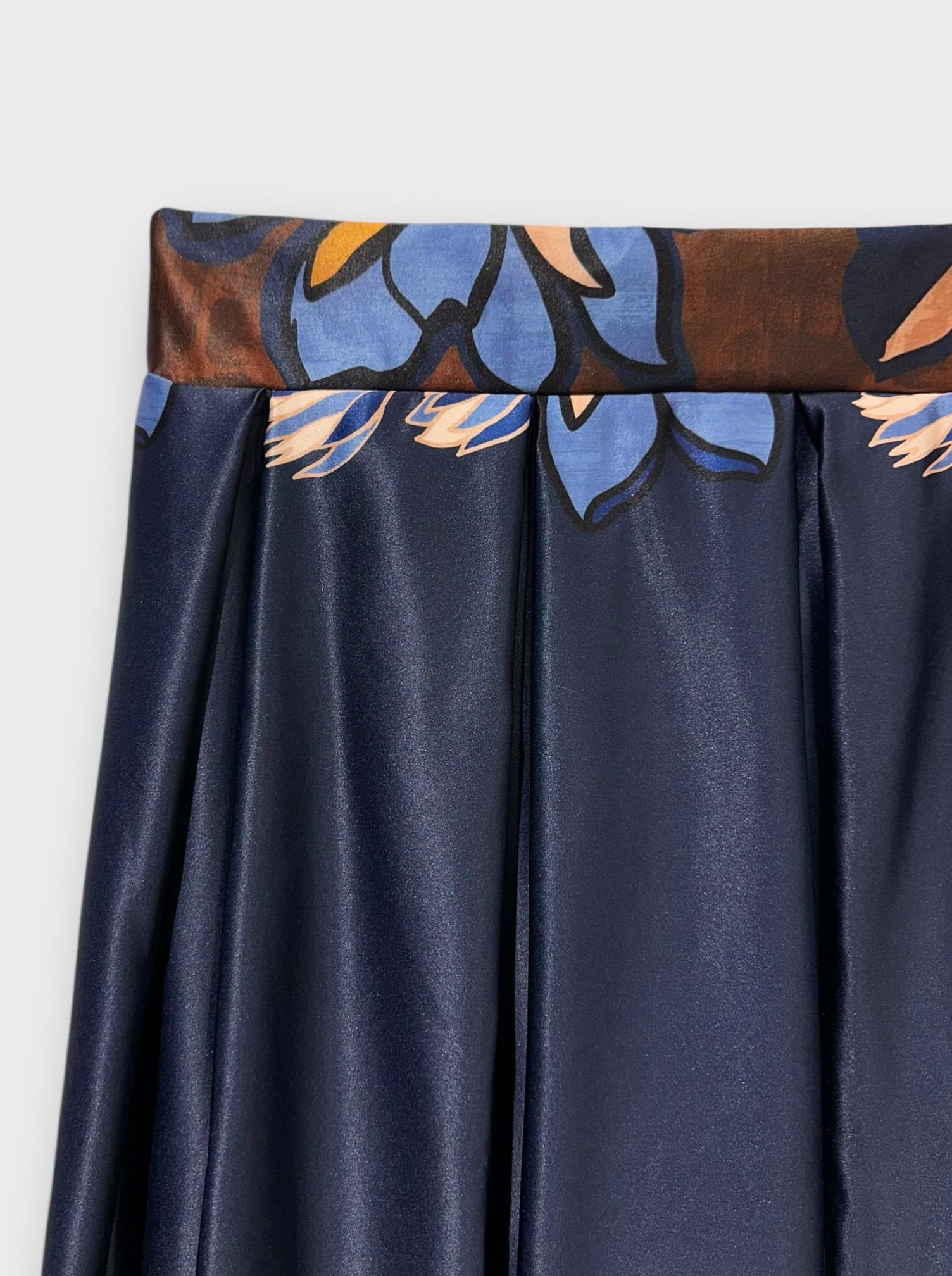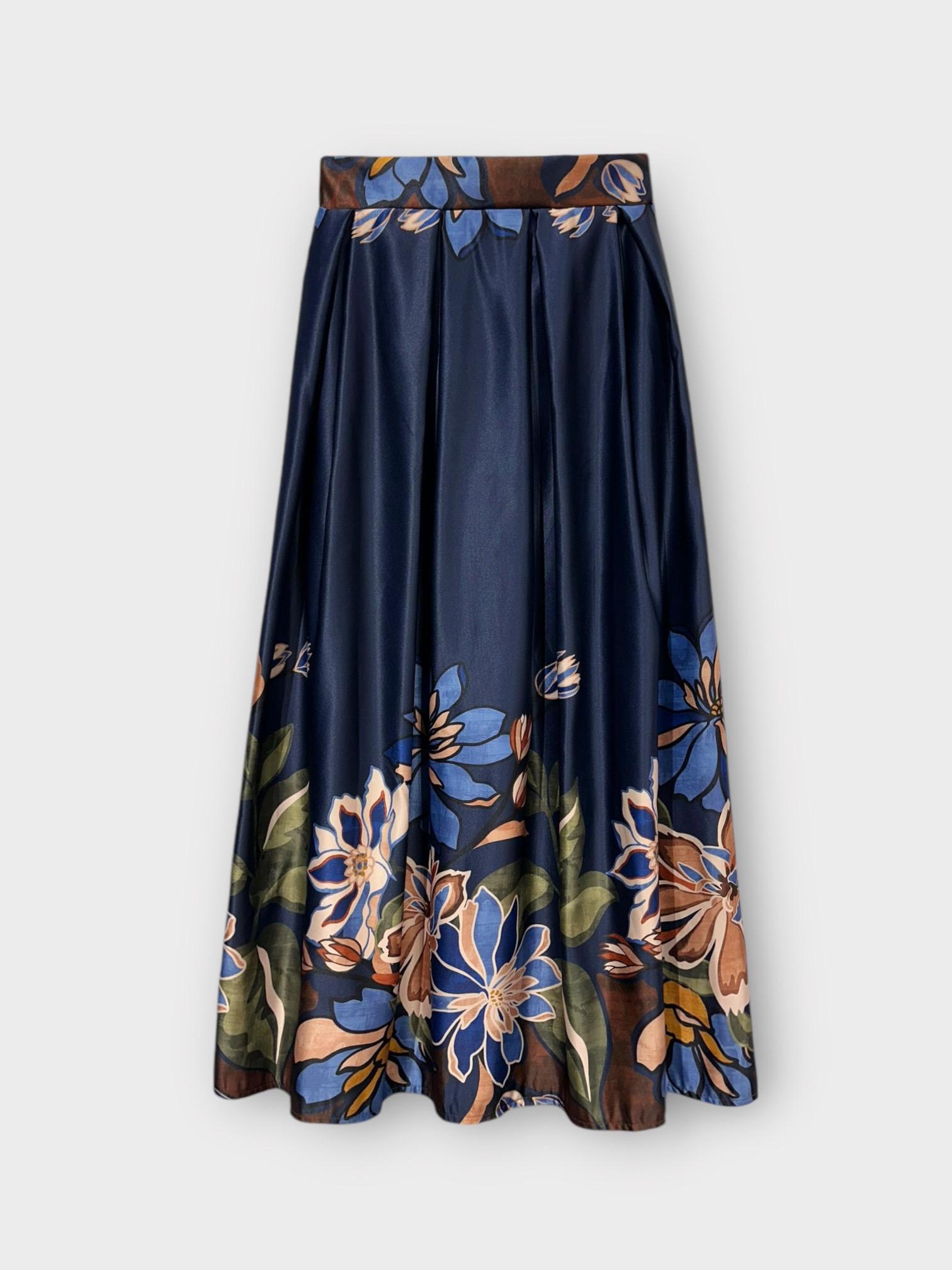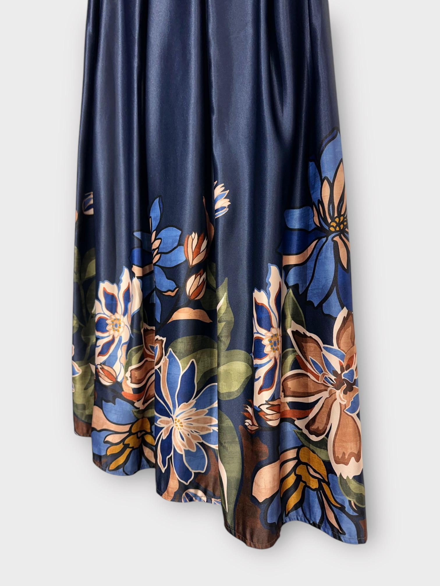 Tämä upea, kukkakuvioitu pitkä hame hurmaa elegantilla tyylillään ja mukavuudellaan. Hameessa on sininen pohja, joka korostaa kauniisti taiteellista printtiä.
