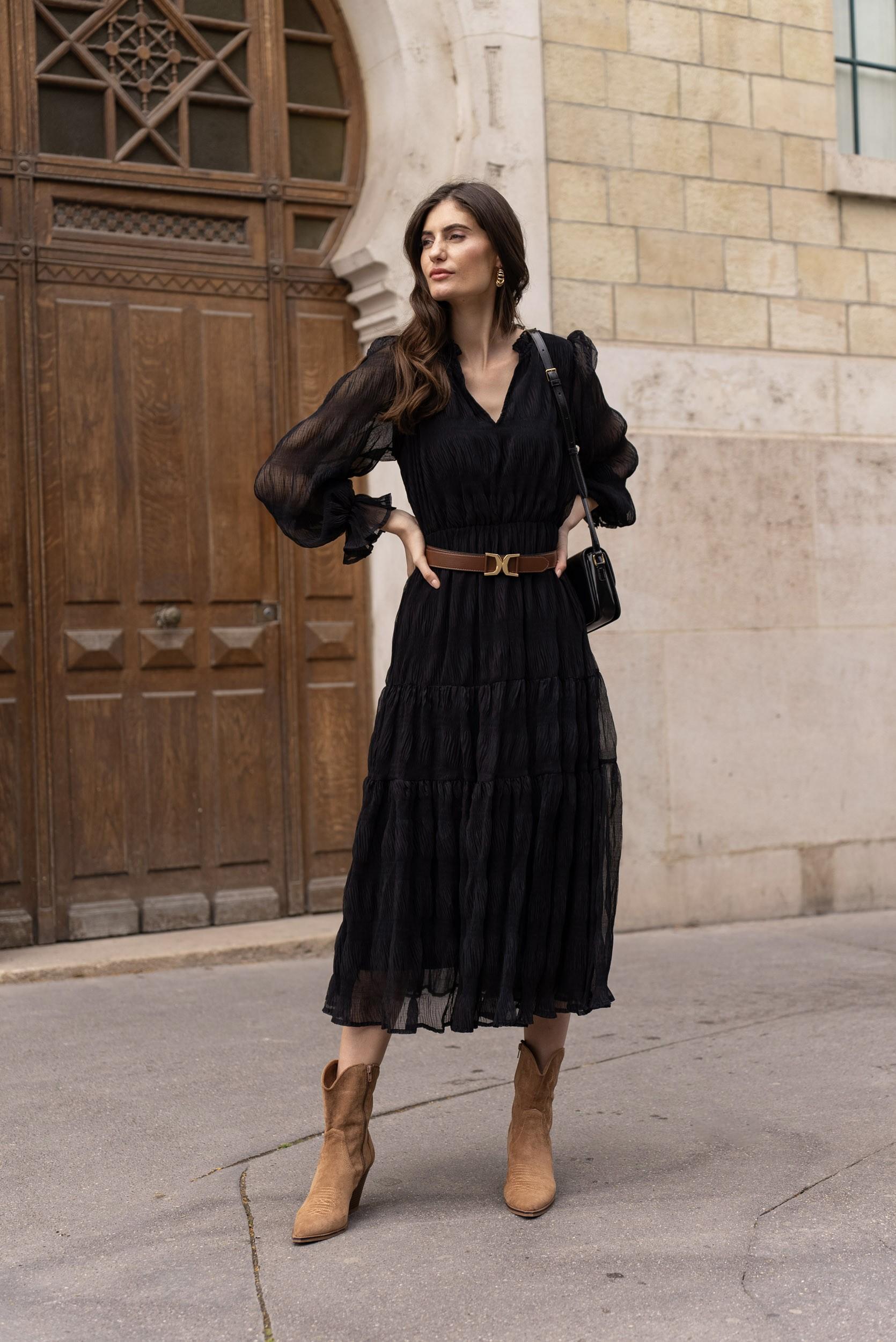 Tämä elegantti pitkä mekko yhdistää kevyen sifongin ja kauniisti laskeutuvan ryppykankaan. Monikäyttöinen ja naisellinen valinta niin arkeen kuin juhlaankin.
