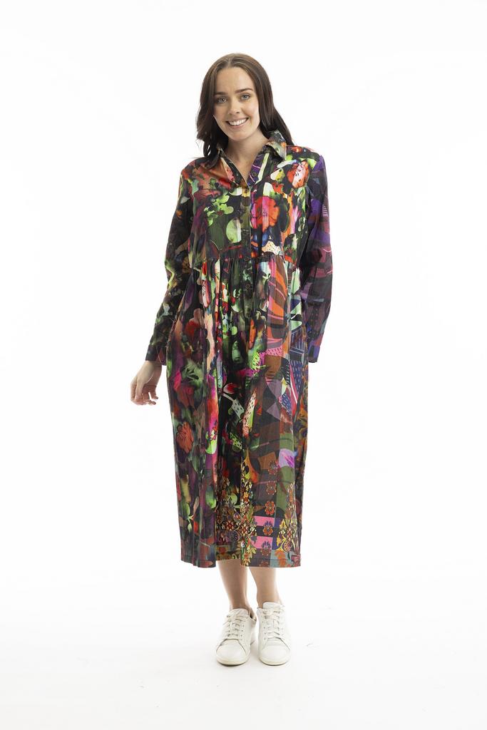 Upea ja näyttävä Orientique Digital Dress -mekko. Kukkakuvioitu pitkä mekko on valmistettu 100 % puuvillasta, ja sen pinta on miellyttävän samettinen. Mekossa on klassinen kaulus sekä napitus edessä koko pituudelta alas asti. Pitkät hihat ja kauniisti alaspäin kellottuva helma luovat elegantin ja rennon ilmeen. Sopii niin arkeen kuin juhlavampaankin käyttöön – helppo stailata eri asusteilla.