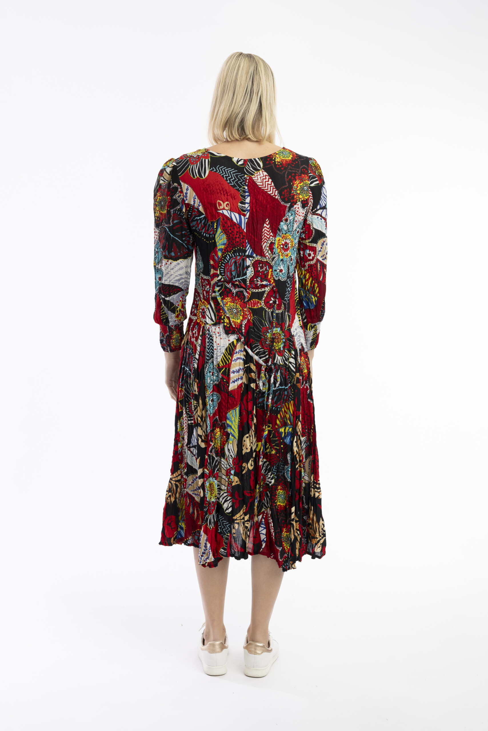 Kaunis ja naisellinen Orientique-mekko kukkakuosilla.  Pitkähihainen, pitkähelmainen malli, joka laskeutuu kevyesti ryppykankaan ansiosta. V-kaula-aukko tuo ilmettä ja tekee mekosta helpon stailata sekä arkeen että juhlavampiin hetkiin.   Kevyt ja hengittävä materiaali tekee mekosta miellyttävän käyttää ympäri vuoden. 🌿 Reilu koko.