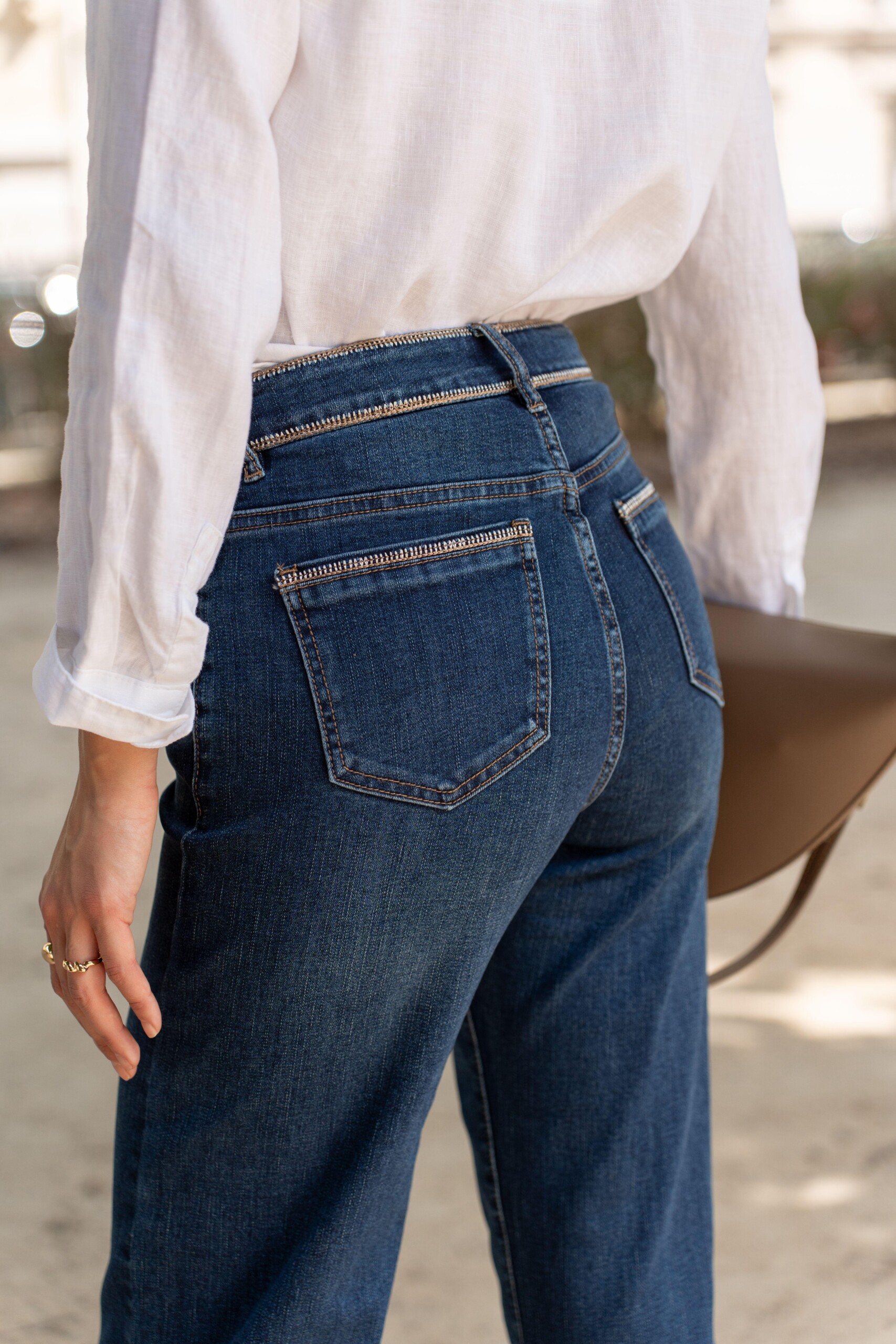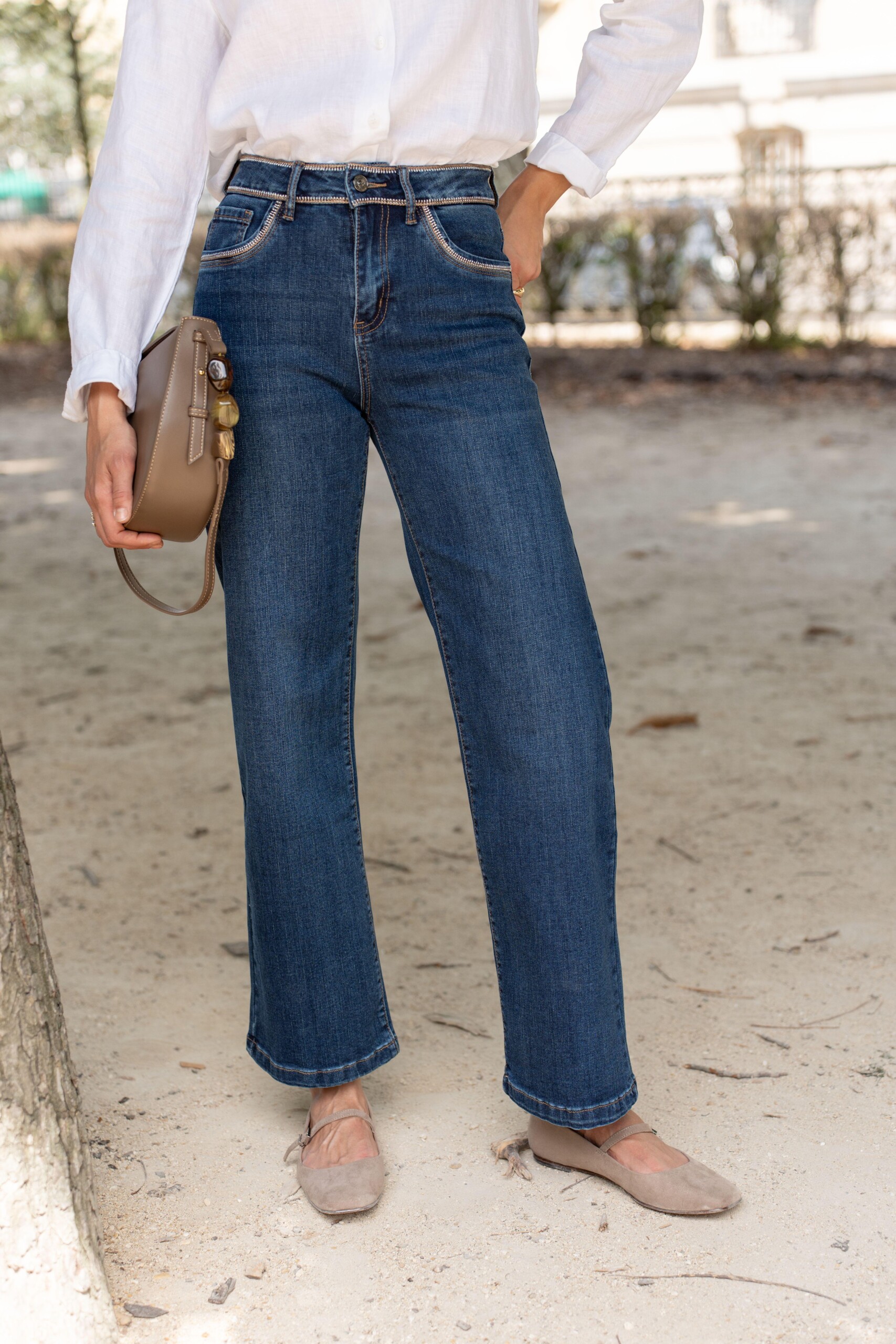 Tyylikkäät siniset farkut, joissa on upea kiiltävä kirjailu vyötäröllä ja taskun suussa. Mallissa on sekä etu- että takataskut ja leveä lahje, joka antaa rennon mutta elegantin ilmeen.